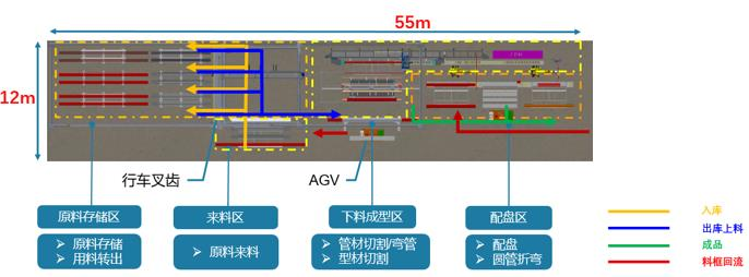 智能化管材加工生产线布局体长55m*宽12m,分为原材料存储区、来料区、下料成型区、配盘区共4个功能区,关键设备包含智能型材立库1套(含行车叉齿1台)、整线控制系统1套、AGV 1台、分料机构1套、小型龙门机械手1套(含型材、管材取料机构各1组)、激光切割机1台、自动弯管机1台、分拣机器人1台、弯管机器人1台、配盘工作站1个等。(如上图所示)
